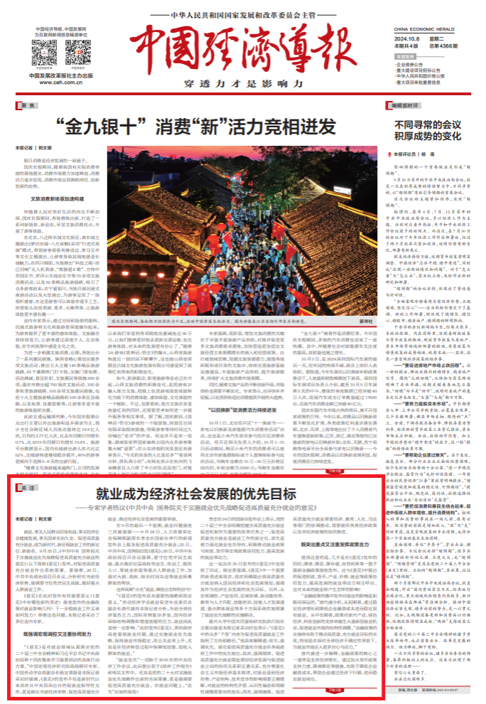 就业,事关人民群众切身利益,事关经济社会健康发展,事关国家长治久安。促进高质量充分就业,成为新时代、新征程就业工作的新定位、新使命。9月25日,《中共中央国务院关于实施就业优先战略促进高质量充分就业的意见》(以下简称《意见》)发布,对促进高质量充分就业作出系统部署。紧接着,26日,中共中央政治局召开会议,分析研究当前经济形势,强调要守住兜牢民生底线,做好重点人群就业工作。
