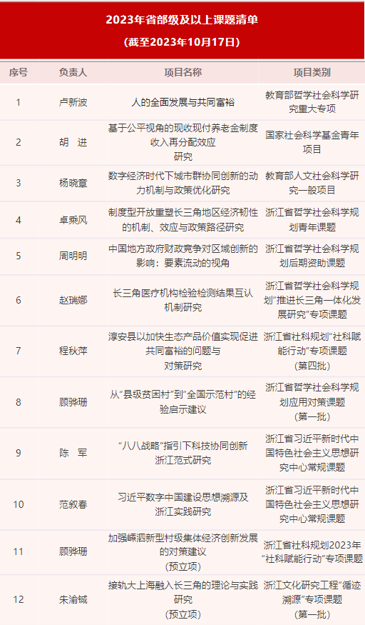 今年公司获批省部级以上课题数量取得新突破。截至10月17日,金年会2023年度已获得10项省部级及以上课题立项,其中,教育部哲学社会科学研究重大专项1项,国家社科基金青年项目1项,教育部人文社科一般项目1项,省哲学社会科学规划课题2项、专项课题2项、应用对策课题1项,省习近平新时代中国特色社会主义思想研究中心常规课题2项;此外,另有两项省级课题获预立项。具体情况如下: